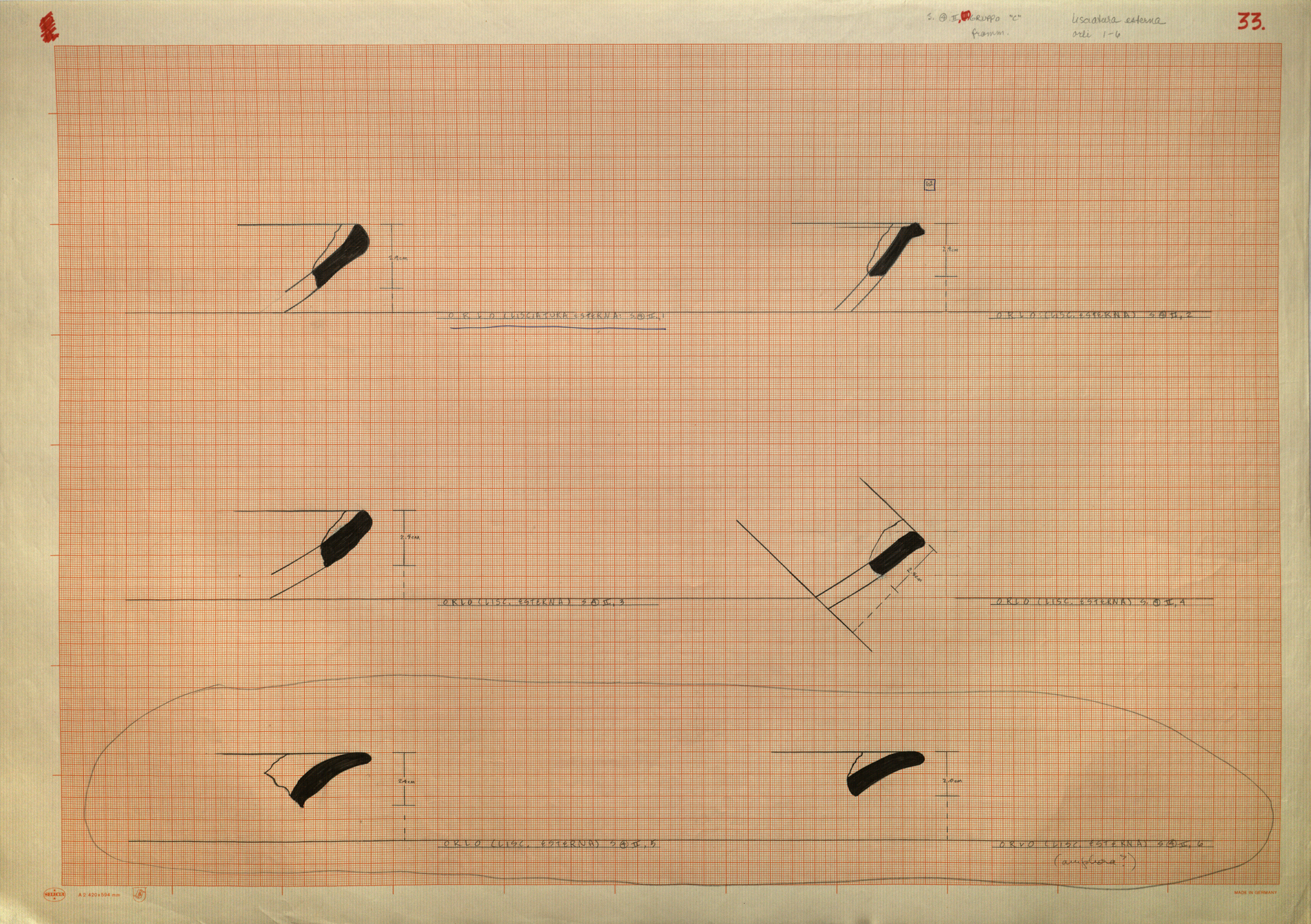 Regia Drawings: [R64 (4) II, (II); GRUPPO "C" - LISCIATURA ESTERNA; FRAMM. ORLI 1-6 / 33.] (AAR_drw_B8_1373-24), 1964