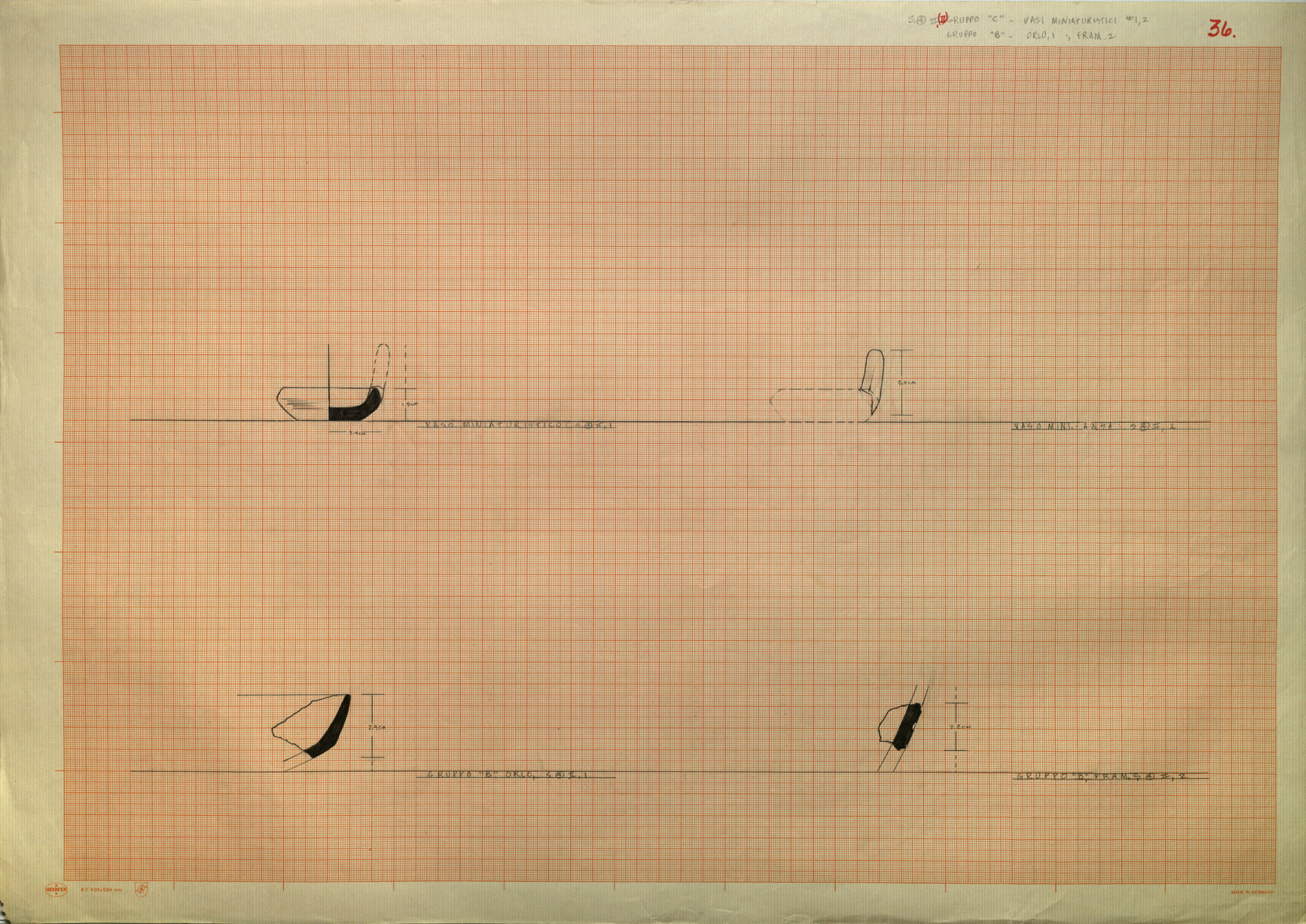 Regia Drawings: [S. (4) II, (II); GRUPPO "C" - VASI MINUATURISTICI # 1,2; GRUPPO "B" - ORLO, 1; FRAM. 2 / 36.] (AAR_drw_B8_1373-29), 1964