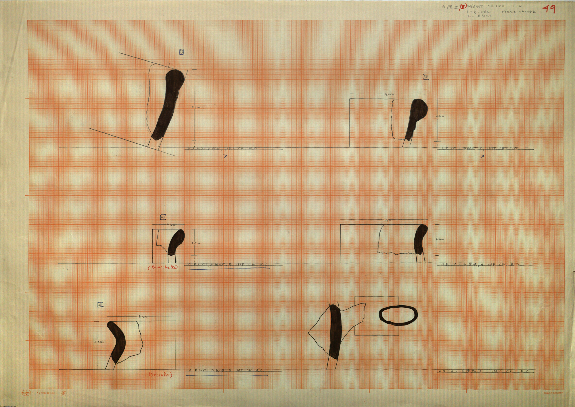 Regia Drawings: [S. (4) II, (II); IMPASTO CHIARO 1-6; 1-5 ORLI FORME CHIUSE; 6 - ANSA / 49] (AAR_drw_B8_1373-42), 1964